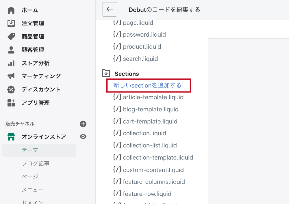 コードエディターで、Sectionsから 新しいsectionを追加 します。