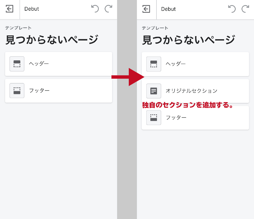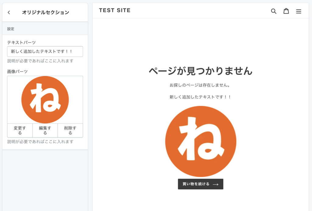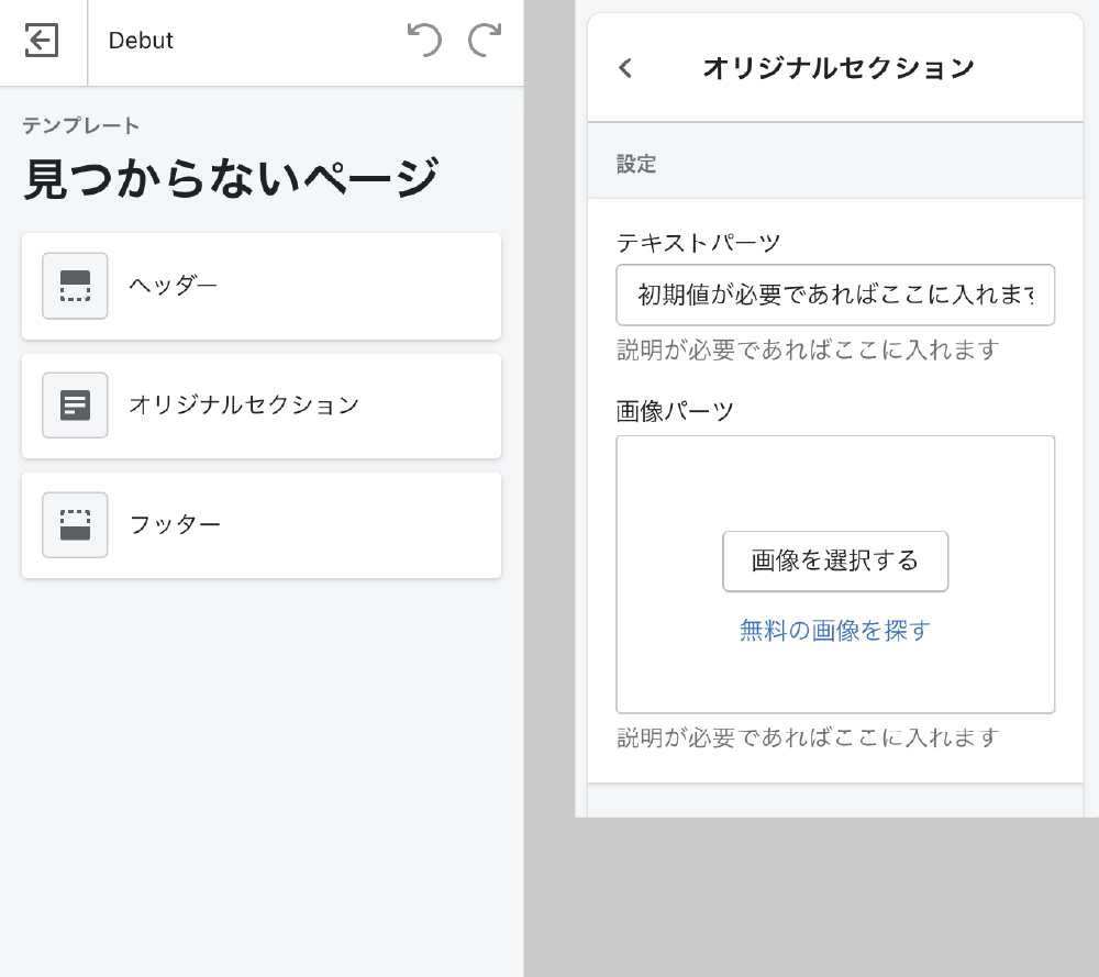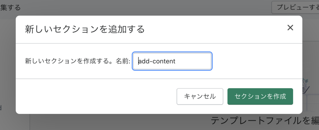テンプレートカスタマイズ画面の編集画面に、独自のセクションを追加してみます。