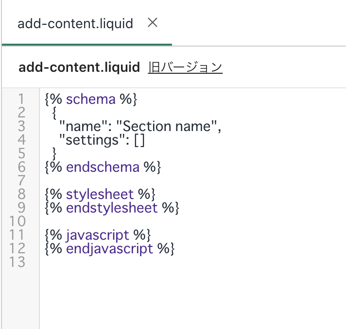 {% schema %} 〜 {% endschema %} 内に追加したいセクションを書いていきます。