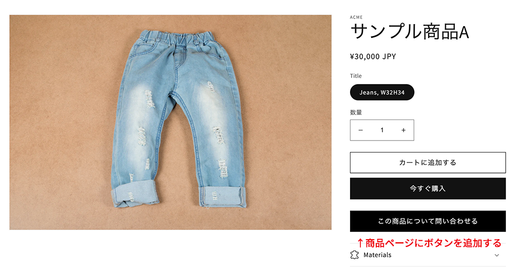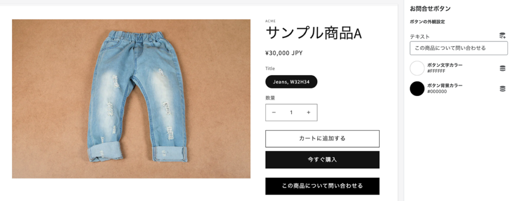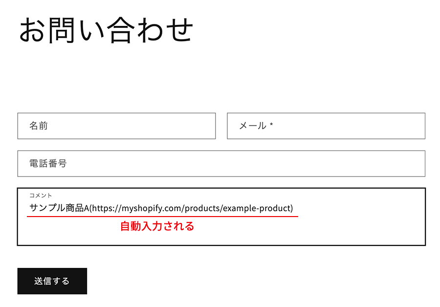 商品ページの「この商品について問い合わせる」ボタンを押すと、お問い合わせページに遷移。その際、商品名とURLを自動でテキストエリアに反映させるカスタマイズです。