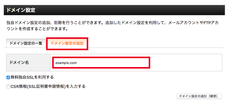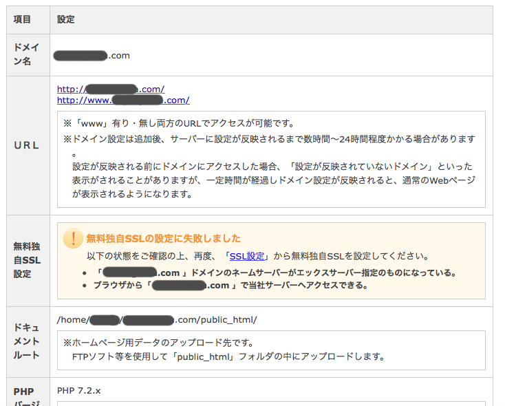 「無料独自SSLを利用する」にチェックを入れていても、「無料独自SSLの設定に失敗しました」と表示される事がありますが、後で設定できるのでとりあえず無視します。(→設定については 8.SSL設定を行う [Xサーバー] へ)