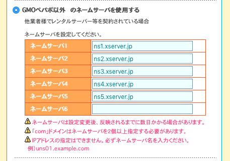 ※Xサーバーの説明では「ネームサーバー変更後、一定時間(最大24時間ほど)を経て、徐々にサーバーが移転されます。」、ムームードメインの説明では「ネームサーバの変更が完了されるまでに、2〜3日かかる場合がございます。」とあります。
