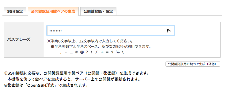 『公開鍵認証用鍵ペアの生成』タブを選択しパスフレーズを入力し、『公開鍵認証用の鍵ペア生成(確認)』をクリック。公開鍵認証用の秘密鍵「(サーバーID).key」ファイルがダウンロードされます。