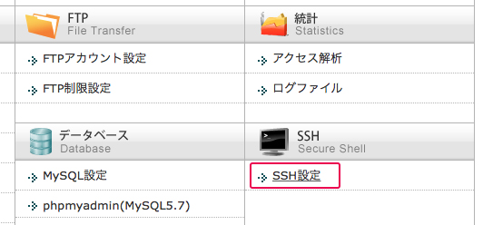 サーバーパネルの管理画面にログインし「SSH設定」をクリック。