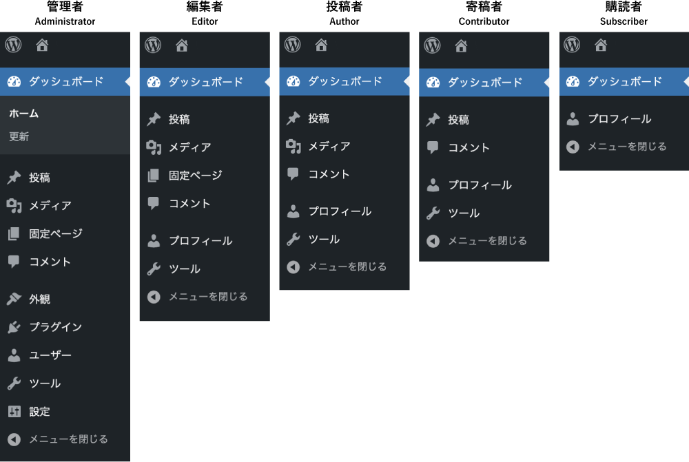権限 Roles | 管理者 Administrator | 編集者 Editor | 投稿者 Author | 寄稿者 Contributor | 購読者 Subscriber |